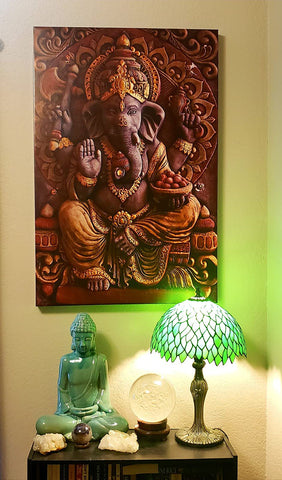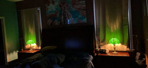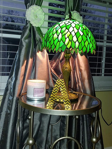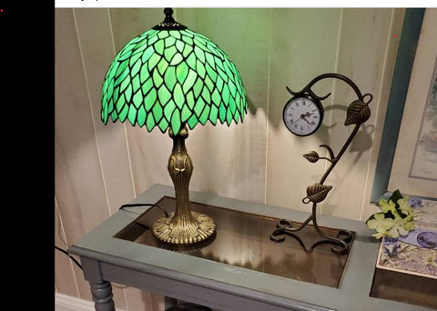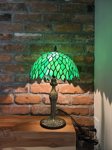 This lamp is everything I hoped it would be. Absolutely beautiful. It is a very nice and sturdy lamp. It looks more expensive than it was! It had a very pretty green glow, We love this elegant and stylish lamp! It looks just like an expensive victorian style antique lamp! Gentle green light is just relaxing, when the lamp is on day or night the different colours of the greens in the leaves is so soothing. My heart smiles every time I look at it. Big thumbs up! Gorgeous!