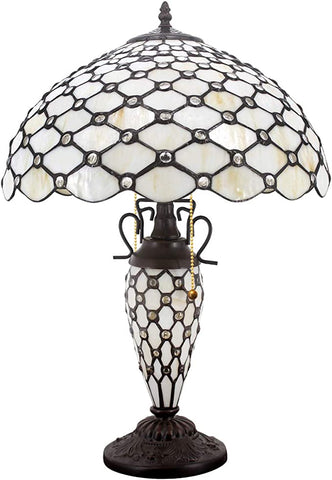 After my unremitting efforts, I finally got another artwork —— cream glass crystal pear beads mother and son vase desk lamp. His price is cheaper compared to other Tiffany lamps.
