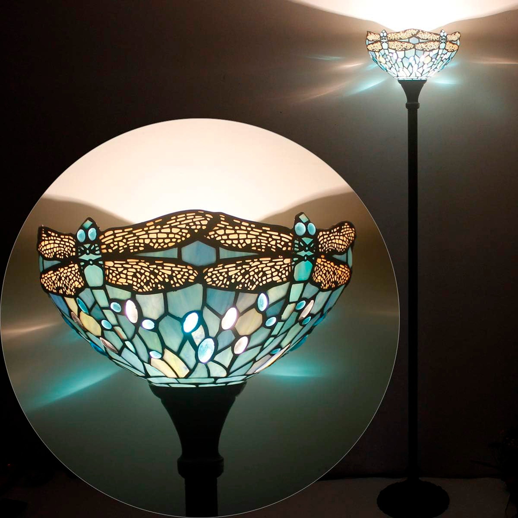WERFACTORY Tiffany Floor Lamp Sea Blue Stained Glass Dragonfly Light 12X12X66 Inches Pole Torchiere Standing Corner Torch Uplight Decor Bedroom Living Room Home Office (LED Bulb Included) S147 Series