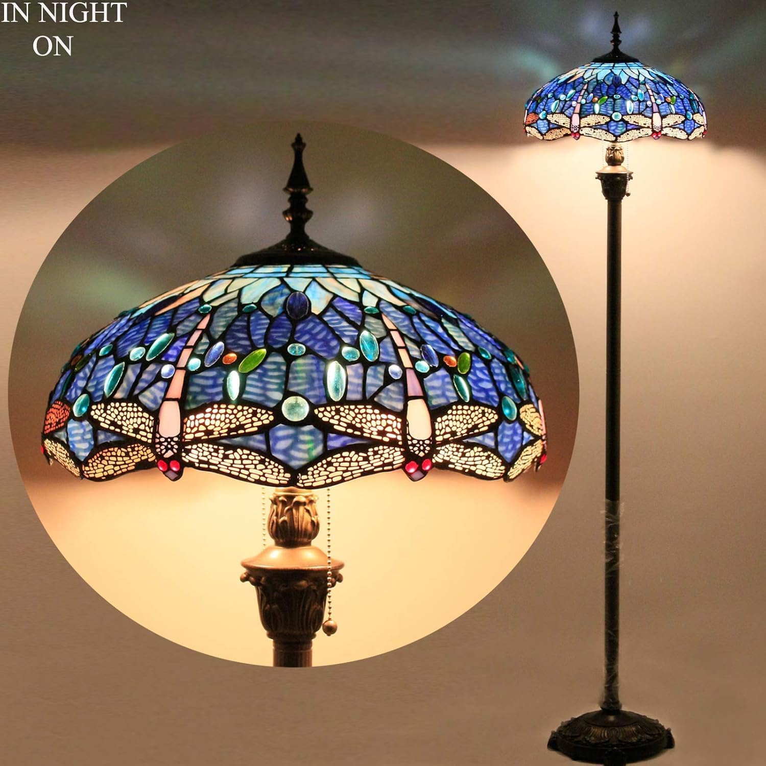 WERFACTORY Tiffany Floor Lamp Dragonfly Blue Stained Glass Standing Reading Light 16X16X64 Inches Antique Pole Corner Lamp Decor Bedroom Living Room Home Office (LED Bulb Included) S631 Series