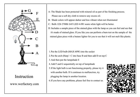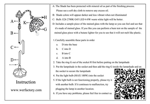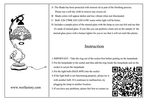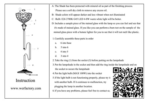 Check Your Goods: Thank you order from Werfactory, Step 1: Check your lamps carefully, Whether any damage and all the parts been included. Step 2: Assemble the tiffany lamp according the following Video . Step 3: Test the lamp working with bulb. |