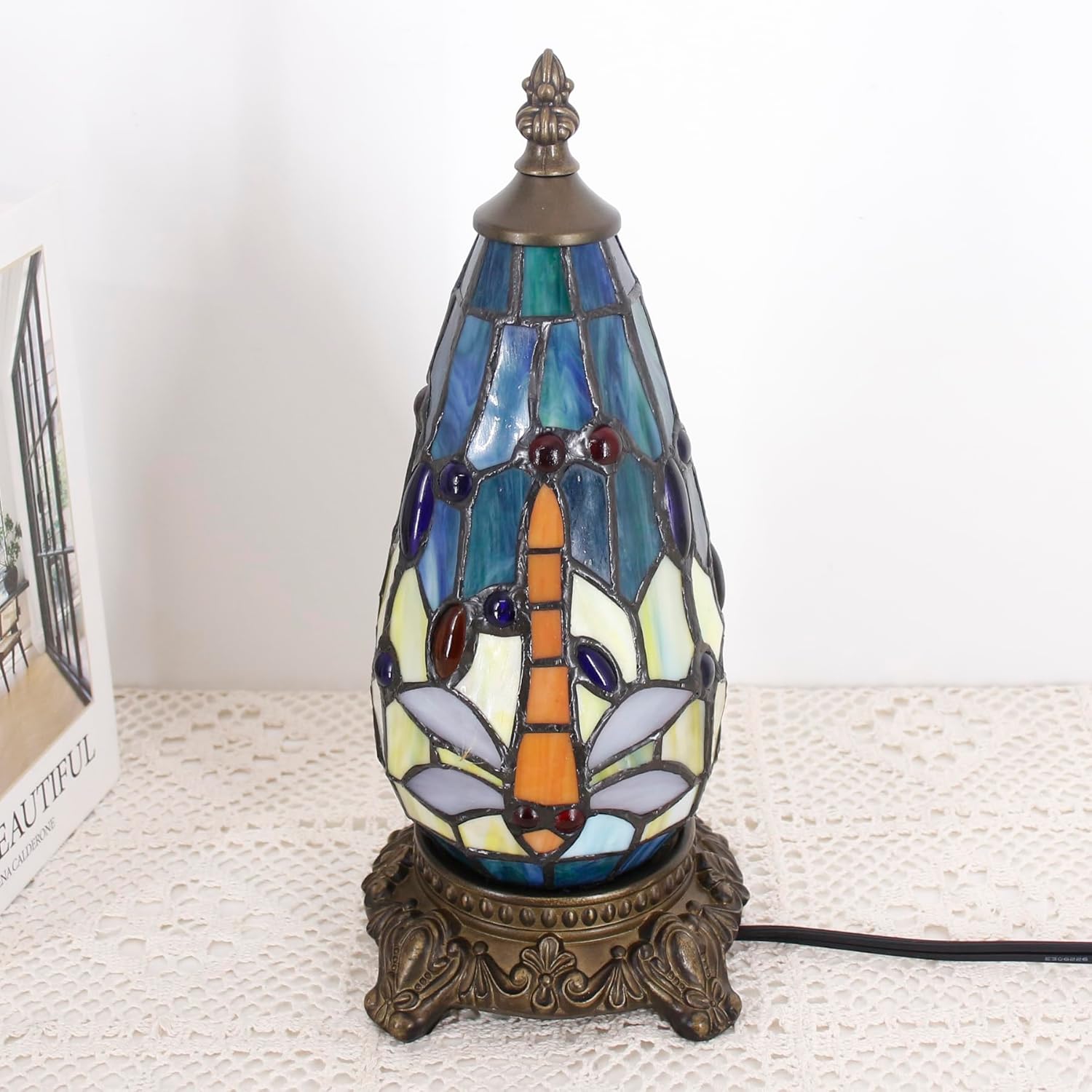 Werfactory® Tiffany Table Lamp Lighthouse Stained Glass Christmas Blue Yellow Dragonfly Light